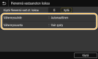 <Käytä Pienennä vast.ot. kokoa> <Ei> <Kyllä>  <Vähennyssuhde> <Automaattinen>  <97 %> <95 %> <90 %> <75 %> <Vähennyssuunta> <Pysty/Vaaka> <Vain pysty>  |