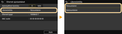 ![]() | Ethernet on standardi tiedon siirtämiseen lähiverkossa (LAN). Voit asettaa liikennöintitavan ja Ethernet-tyypin. Yleensä laitetta voi käyttää muuttamatta oletusasetuksia (<Ethernet-ajuriasetukset>), mutta voit muuttaa niitä verkkoympäristöösi sopiviksi. |