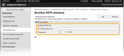 Laitteen SNTP tukee sekä NTP-palvelinta (versio 3) että SNTP-palvelinta (versiot 3 ja 4). Lisätietoja suoritettavista perustoimenpiteistä, kun laitteen asetukset tehdään etäkäyttöliittymästä on kohdassa Valikkovaihtoehtojen asettaminen Etäkäyttöliittymästä. |
