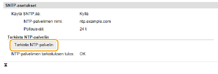 NTP/SNTP-palvelimen tiedonsiirron testaaminenVoit katsoa tallennetun palvelimen tiedonsiirtotilan napsauttamalla [Asetukset/Tallennus] [Verkkoasetukset] [Tarkista NTP-palvelin] kohdasta [SNTP-asetukset]. Jos yhteys on muodostettu oikein, tulos näkyy alla näytetyn kaltaisena. Huomaa, että tämä toiminto ei säädä järjestelmän kelloa.![]() |