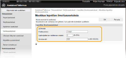 2 | Valitse [Ilmoita]-valintaruutu ja määritä vaaditut asetukset. ![]() [Ilmoita] Valitse tämä valintaruutu, jos haluat, että laitehallinnan ohjelmistolle ilmoitetaan laitteen virran tila. Kun valitaan [Ilmoita], laite välttää turhaa tiedonsiirtoa lepotilan aikana ja kokonaisvirrankulutus pienenee. [Porttinumero] Muuta tämän toiminnon porttinumero verkkoympäristön mukaan. [Läpikuljettavien reitittimien määrä] Määritä, kuinka monen reitittimen läpi ilmoituspaketit voivat kulkea. [Ilmoitusväli] Määritä, kuinka usein laite ilmoittaa laitehallintaohjelmistolle virran tilan. |
