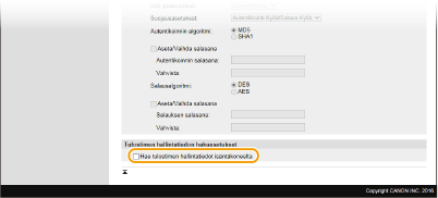 Valitse haluttu autentikointi- ja salausasetusten yhdistelmä vaihtoehdoista [Autentikointi Kyllä/Salaus Kyllä], [Autentikointi Kyllä/Salaus Ei] tai [Autentikointi Ei/Salaus Ei].