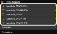 Voit etsiä yhteyden muodostukseen käytettävissä olevia langattomia reitittimiä (tai liityntäpisteitä) ja valita sellaisen laitteen näytöstä. Syötä verkkoavaimeksi salausavain/salasana. Ennen kuin valitset langattoman reitittimen, tarkista ja kirjoita muistiin tarvittavat asetustiedot, mukaan lukien SSID ja verkkoavain (