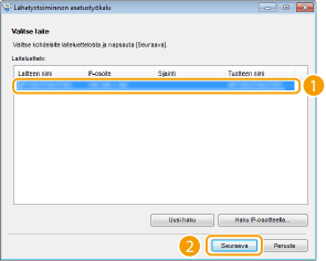 5 | Valitse laite kohdasta [Laiteluettelo] ja napsauta [Seuraava]. ![]() ![]() Jos laitetta ei näytetä kohdassa [Laiteluettelo] Napsauta [Uusi haku]. Jos ongelma jatkuu, napsauta [Haku IP-osoitteella], syötä laitteen IP-osoite ja napsauta sitten [OK]. |