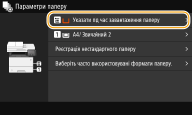 Після реєстрації параметрів паперу за промовчанням екран параметрів паперу не відображається під час завантаження паперу й завжди використовуються ті самі параметри. Якщо завантажити папір іншого формату або типу, не змінивши параметри паперу, це може призвести до неправильного друку. Щоб уникнути виникнення цієї проблеми, виберіть <Указати під час завантаження паперу> під час виконання кроку 3, а потім завантажте папір. |