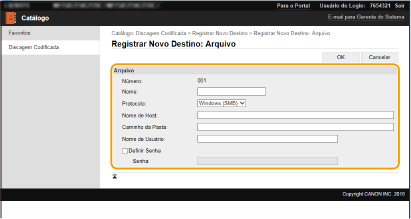 Para registar o destino da pasta partilhada ou do servidor FTP, selecione [Arquivo].