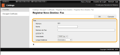 Também pode especificar [ECM TX] e [Velocidade] a partir de <Configurações de Fax> ( <Enviar>) no painel de controlo. No entanto, as definições efetuadas a partir de <Catálogo> são ativadas para as definições detalhadas de destinos registados no livro de endereços.