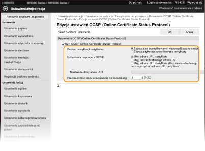 Zaznacz pole wyboru dla [Użyj OCSP (Online Certificate Status Protocol)] i skonfiguruj protokół statusu internetowego certyfikatu (OCSP).