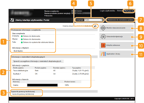 Po zalogowaniu się do Zdalnego interfejsu użytkownika zostanie wyświetlona następująca strona główna. W tej części opisano podstawowe czynności, a także elementy wyświetlane na stronie głównej.