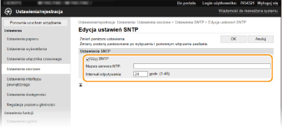 Sprawdzanie komunikacji z serwerem NTP/SNTPStatus komunikacji z zarejestrowanym serwerem można wyświetlić, klikając [Ustawienia/rejestracja]