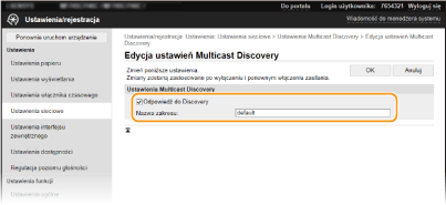 Zaznaczenie tego pola wyboru umożliwia skonfigurowanie urządzenia tak, aby odpowiadało na pakiety wyszukiwania metodą multiemisji programu do zarządzania urządzeniami oraz włączenie monitorowania za pomocą programu do zarządzania urządzeniami.