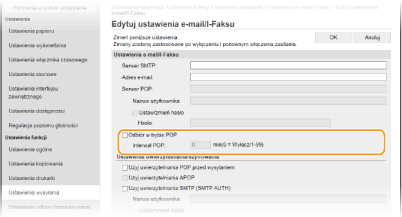 Ustawia odstęp czasu (w minutach) między automatycznymi połączeniami z serwerem POP3. Jeśli na serwerze znajdują się dokumenty I-faks, zostaną automatycznie pobrane i wydrukowane.