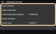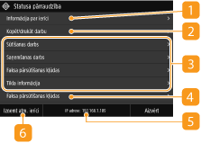 Ja atlasāt vienumu <Statusa pārr.>, tiek parādīts ekrāns, kurā varat pārbaudīt ar dokumentiem veicamo darbību norisi, kā arī iekārtas statusu un tīkla iestatījumu informāciju.