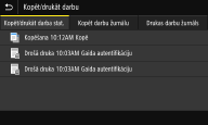 Parāda izvēlētā vienuma pašreizējo statusu. Kā piemērs tālāk ir parādīts ekrāns <Kopēt/drukāt darbu>.