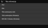 Parāda tādus tīkla iestatījumus kā iekārtas IP adresi un tādu statusu kā bezvadu LAN sakaru stāvokli.