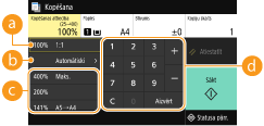 Varat palielināt vai samazināt kopiju izmēru, izmantojot iepriekš iestatītu kopēšanas koeficientu, piemēram, <A5->A4>, vai iestatot pielāgotu kopēšanas koeficientu ar 1% soli.