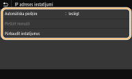 Izvēlieties <Izslēgt>. Ja izvēlēsities opciju <DHCP>, kad šie pakalpojumi nebūs pieejami, iekārta tērēs laiku un saziņas resursus, meklējot šos pakalpojumus tīklā.