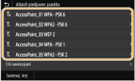 Varat meklēt savienošanai pieejamos bezvadu maršrutētājus (jeb piekļuves punktus) un izvēlēties kādu no tiem iekārtas displejā. Kā tīkla atslēgu ievadiet šifrēšanas atslēgu/paroli. Pirms bezvadu maršrutētāja izvēles pārbaudiet un pierakstiet vajadzīgo iestatīšanas informāciju, tostarp SSID un tīkla atslēgu (