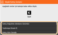 Ne zaman bir mesaj görüntüleneceğini belirtinToner kartuşunda kalan ve bir mesaj tetikleyecek miktarı yüzde olarak istediğiniz değere ayarlayabilirsiniz. <Kartuş Hzrl Zamanlama Görüntl>