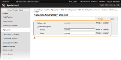 Parolayı ayarlamak veya değiştirmek için onay kutusunu seçin ve yeni parola için [Parola] ve [Onay] metin kutularına alfasayısal karakter girin. |