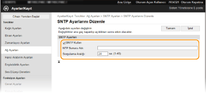 NTP/SNTP sunucusu ile iletişimi test etme[SNTP Ayarları] bölümünde [Ayarlar/Kayıt]