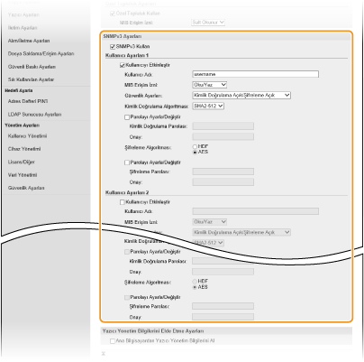 Basit Ağ Yönetimi Protokolü (SNMP), Yönetim Bilgi Tabanı (MIB) kullanılarak bir ağdaki iletişim aygıtlarını izleme ve kontrol etme protokolüdür. Makine, SNMPv1'i ve güvenliği geliştirilmiş SNMPv3'ü destekler. Belgeleri yazdırırken veya Uzak Kullanıcı Arabirimini kullanırken bir bilgisayardan makinenin durumunu kontrol edebilirsiniz. SNMPv1 veya SNMPv3'ü ayrı ayrı veya her ikisini de aynı anda etkinleştirebilirsiniz. Her bir sürümün ayarlarını, ağ ortamınıza ve kullanım amacınıza uyacak şekilde belirtin.