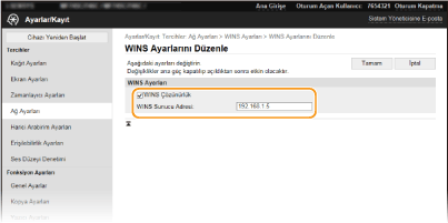 [Bilgisayar Adı/Çalışma Grubu Adı Ayarları] içinde [NetBIOS Kullan] onay kutusunun işaretini kaldırırsanız WINS ayarı devre dışı kalır. WINS kullanırken [NetBIOS Kullan] onay kutusunu seçtiğinizden emin olun.