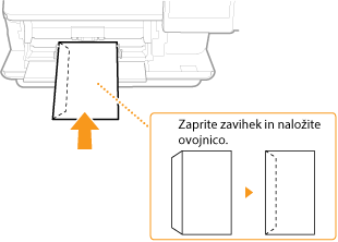 Kuverte Monarch, COM10, DL ali ISO-C5 naložite v pokončni usmerjenosti (krajši rob ob napravi) in tako, da bo stran brez lepila (sprednja) obrnjena navzgor. Na hrbtno stran kuvert ni mogoče tiskati.
