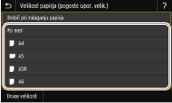 Če velikost papirja, ki jo pogosto uporabljate, registrirate za gumbe od <S1> do <S3>, lahko to velikost izberete z enim dotikom. Registracija velikosti papirja po meri