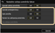 <Uporabi predogled faksa>Določite, ali želite predogled prejetih dokumentov, shranjenih v pomnilniku. Izberite <Vklopi> za predogled dokumentov prek vmesnika Remote UI (Oddaljeni uporabniški vmesnik).