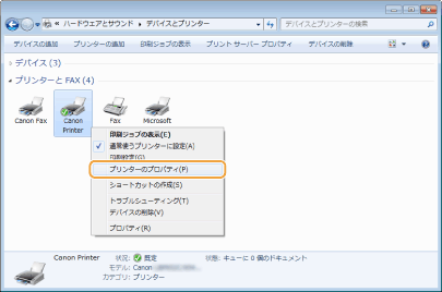 本機のアイコンを右クリックし、[プリンターのプロパティ]または[プロパティ]をクリックする