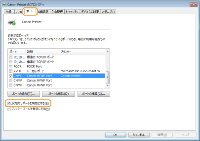 [ポート]タブで[双方向サポートを有効にする]にチェックマークが付いていることを確認する