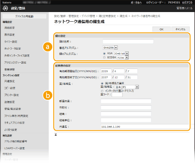 Transport Layer Security(TLS)を使った暗号化通信に必要な鍵と証明書を生成できます。TLSは、リモートUIを使って本機にアクセスするときに使用できます。「ネットワーク通信用」に生成した鍵と証明書では自己署名証明書が使われます。
