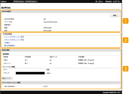管理者権限でログインすると、次のAirPrint専用ページが表示されます。