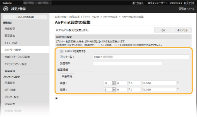 本体の名称、設置場所などAirPrint設定で入力した内容を確認できます。[編集]をクリックすると設定内容を変更することができます。