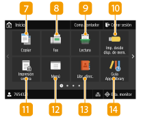 ![]() | <Copiar>Utilice este botón para iniciar la copia. Copia <Fax>Utilice este botón para enviar un fax desde el equipo. Fax <Lectura>Escanea un original y lo convierte en un archivo electrónico. Podrá guardar los archivos escaneados en su ordenador o enviarlos por correo electrónico. Escaneado <Imp. desde disp. de mem.>Imprime archivos almacenados en un dispositivo de memoria USB. Impresión desde memoria USB (Impresión desde dispositivo de memoria) <Impresión segura>Utilice esta función para imprimir un documento protegido . Impresión de un documento protegido con un PIN (Impresión Segura) <Menú><Opciones de funciones>, <Preferencias>, y muchas otras configuraciones del equipo se inician desde este botón. Lista del menú de configuración <Libr. direc.>Utilícelo para registrar o editar los destinos para correos electrónicos y faxes. También podrá ver un destino registrado al enviar un correo electrónico o un fax. Registro de destinosy <Guía App. Library>Muestra una descripción de la Biblioteca de aplicaciones. |