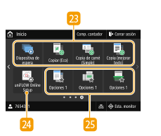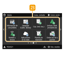 en el panel de control. Utilice esta pantalla para especificar la configuración y registrar funciones.![]() | Cambiar de páginaUtilícelo para ver otra página de la pantalla Inicio. También puede deslizar el dedo lateralmente para cambiar de página. <Comp. contador>Muestra el volumen total de impresiones. Visualización del valor del contador <Cerrar sesión>Utilice este botón para cerrar la sesión en el equipo. <Esta. monitor>Púlsela para consultar el estado de impresión, para ver el historial de uso o para ver las opciones de red, como puede ser la dirección IP del equipo. Asimismo, podrá consultar el estado del equipo, como por ejemplo, la cantidad restante de papel y la cantidad de tóner restante en los cartuchos, o si se ha producido algún error. Pantalla <Monitor de estado> Icono de LAN con cable/LAN inalámbricaEl icono de LAN con cable aparece cuando se conecta a una LAN con cable y el icono de LAN inalámbrica aparece cuando se conecta a una LAN inalámbrica. Pulse este icono para configurar las opciones de LAN con cable/inalámbrica. <Red> Nombre de usuario/IDSe muestra el nombre o ID del usuario que ha iniciado sesión. |