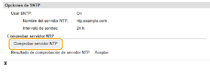 Prueba de comunicación con el servidor NTP/SNTPPodrá visualizar el estado de comunicación con el servidor registrado haciendo clic en [Configuración] [Opciones de red] [Comprobar servidor NTP] en [Opciones de SNTP]. Si se ha establecido correctamente una conexión, el resultado se mostrará como se indica abajo. Tenga en cuenta que esta operación no ajusta el reloj del sistema.![]() |