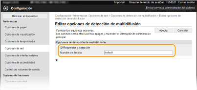 2 | Seleccione la casilla de verificación [Responder a detección] y especifique las opciones necesarias. ![]() [Responder a detección] Marque la casilla de verificación para que el equipo responda a los paquetes de detección de multidifusión del software de administración de dispositivos y habilite la supervisión por parte del software de administración de dispositivos. ![]() Para cambiar el número de puerto para la detección multidifusión, consulte Cambios en los números de puerto. [Nombre de ámbito] Para incluir el equipo en un ámbito específico, introduzca caracteres alfanuméricos en el nombre de ámbito. |