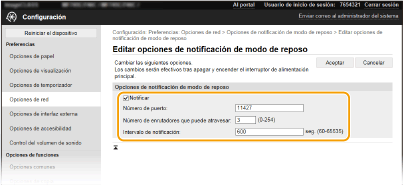 2 | Seleccione la casilla de verificación [Notificar] y especifique las opciones necesarias. ![]() [Notificar] Marque la casilla de verificación para informar a un software de administración de dispositivo del estado de energía del equipo. Si se selecciona [Notificar], el equipo evitará las comunicaciones innecesarias durante el modo de reposo y reducirá el consumo total de energía. [Número de puerto] Cambie el número de puerto de esta función según el entorno de red. [Número de enrutadores que puede atravesar] Especifique a través de cuántos routers pueden pasar los paquetes de notificaciones. [Intervalo de notificación] Especifique con qué frecuencia informará el equipo a un software de administración de dispositivos sobre su estado energético. |