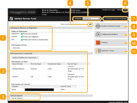 Quando você acessa a Interface Remota, a seguinte página do Portal aparece. Esta seção descreve os itens exibidos na página do Portal e as operações básicas.