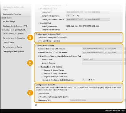 O DNS (Domain Name System) fornece um serviço para a resolução de nome associado a um nome de host (ou domínio) com um endereço IP. Configure as definições de opção DNS, mDNS ou DHCP conforme necessário. Observe que os procedimentos para a configuração do DNS são diferentes para o IPv4 e o IPv6.