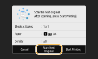 1 | Place the next original on the platen glass, and select <Scan Next Original>. You can also specify <Density> and <Original Type> separately for each original. ![]() Repeat this step until you finish scanning the entire original. |