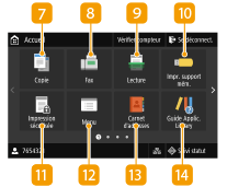 ![]() | <Copie>Utilisez ce bouton pour démarrer la copie. Copie <Fax>Utilisez ce bouton pour envoyer un fax depuis l'appareil. Fax <Lecture>Numérise un document original et le convertit en un fichier électronique. Vous pouvez enregistrer les fichiers numérisés sur un ordinateur ou les envoyer par e-mail. Numérisation <Impr. support mém.>Imprime des fichiers stockés sur un périphérique mémoire USB. Impression depuis un périphérique mémoire USB (impression support mémoire) <Impression sécurisée>Utilisez cette fonction pour imprimer un document sécurisé. Impr. d'un document sécurisé par un code PIN (Impression sécurisée) <Menu><Réglages des fonctions>, <Préférences> et de nombreux autres réglages de l'appareil sont accessibles depuis ce bouton. Liste du menu des réglages <Carnet adr.>Utilisez-le pour enregistrer ou modifier les destinataires des e-mails et des fax. Vous pouvez également afficher un destinataire enregistré lors de l'envoi d'un e-mail ou d'un fax. Enregistrement des destinataires <Guide Applic. Library>Affiche une description d'Application Library (Bibliothèque d'applications). |