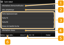 Lorsque vous appuyez sur <Suivi statut>, un écran s'affiche dans lequel vous pouvez consulter la progression du traitement des documents ainsi que l'état de l'appareil et les réglages réseau.