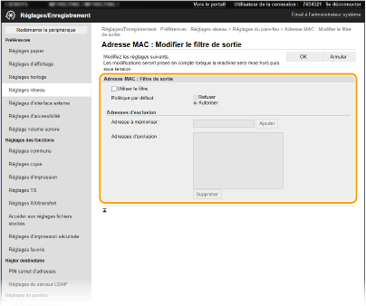 2 | Indiquez les exceptions voulues. Saisissez l'adresse MAC dans la zone de texte [Adresse à mémoriser] et cliquez sur [Ajouter]. Vous n'avez pas besoin de délimiter l'adresse par des tirets ou par deux-points. ![]() Vérification des erreurs de saisie En cas de saisie incorrecte des adresses MAC, vous risquez de pas pouvoir accéder à l'appareil via l'interface utilisateur distante. Si cela se produit, réglez <Filtre d'adresse MAC> sur <Désact.>. <Filtre d'adresse MAC> ![]() Si le filtre de sortie [Refuser] est sélectionné Les paquets de multidiffusion et de diffusion ne peuvent pas être filtrés. Suppression d'une adresse MAC des exceptions Sélectionnez une adresse MAC et cliquez sur [Supprimer]. ![]() | ||||