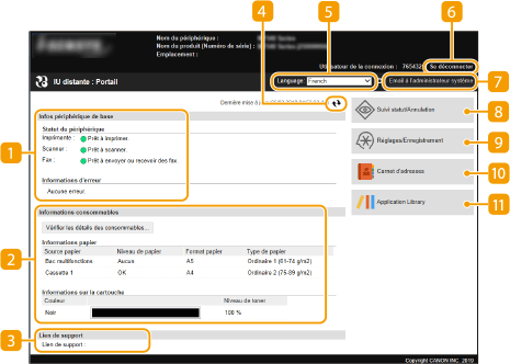 Affiche l'état actuel de l'appareil et les informations d'erreur. En cas d'erreur, le lien vers la page Informations d'erreur apparaît.