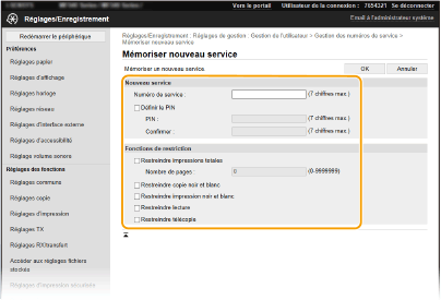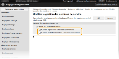 Pour en savoir davantage sur les cases à cocher [Autoriser impressions sans codes confidentiels]/[Autoriser les tâches de lecture sans codes confidentiels], reportez-vous à la section Blocage de tâches en cas de numéro de service inconnu.