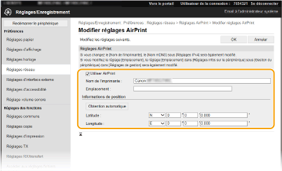 Vous pouvez enregistrer des informations, notamment le nom de l'appareil et le lieu de l'installation, destinées à identifier l'appareil. Il est également possible de désactiver la fonction AirPrint de l'appareil. Servez-vous de l'interface utilisateur distante pour les modifier.