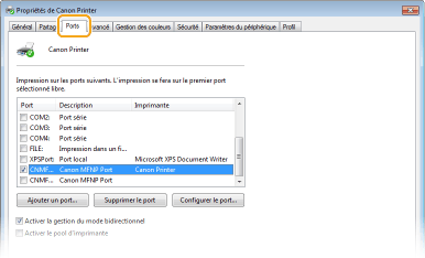 Ajout d'un portPort MFNP (environnement IPv4 uniquement) | Ce port permet une détection automatique de l'adresse IP de l'appareil. En cas de modification de l'adresse IP, la connexion est maintenue, sous réserve que l'appareil et l'ordinateur appartiennent au même sous-réseau. Vous n'avez pas besoin d'ajouter un nouveau port en cas de modification de l'adresse IP. Si vous utilisez l'appareil dans un environnement IPv4, vous devez, en principe, sélectionner ce type de port. ![]() Vous ne pouvez ajouter un port MFNP que si vous avez installé le pilote à partir du CD-ROM/DVD-ROM fourni ou bien à partir du site Web Canon. |